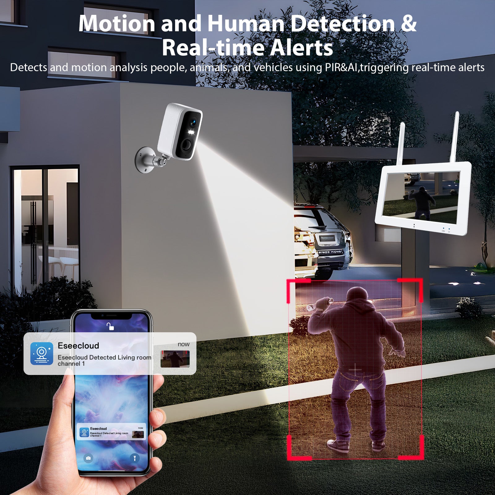 - PIR Motion Detection & APP Alerts & Two-Way Audio:Our security camera with monitor has built-in smart AI motion detection to identify people, pets, and vehicles for accuracy.